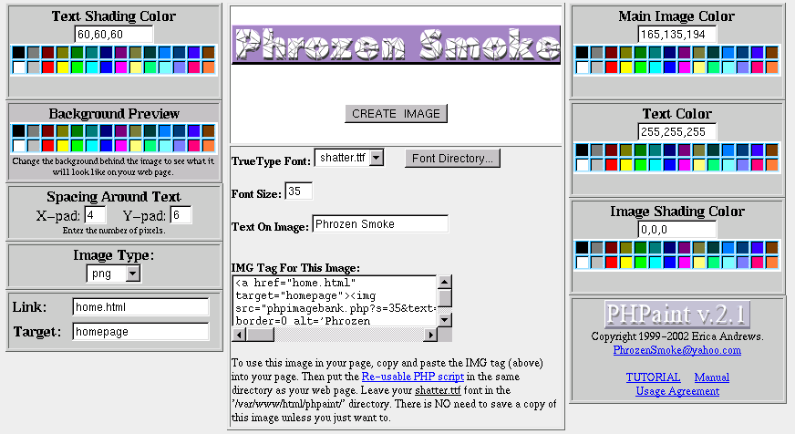 PHPaint is Copyright 1999-2005 by Erica Andrews (PhrozenSmoke ['at'] yahoo.com). See the license file for a copy of the GPL license this software is distributed under. Any use, modificiation, or redistribution of PHPaint or it components not in accordance with the license is strictly prohibited.