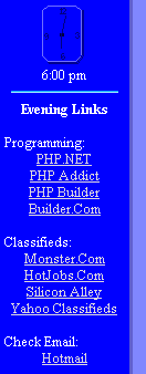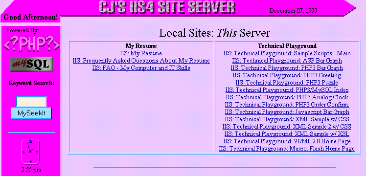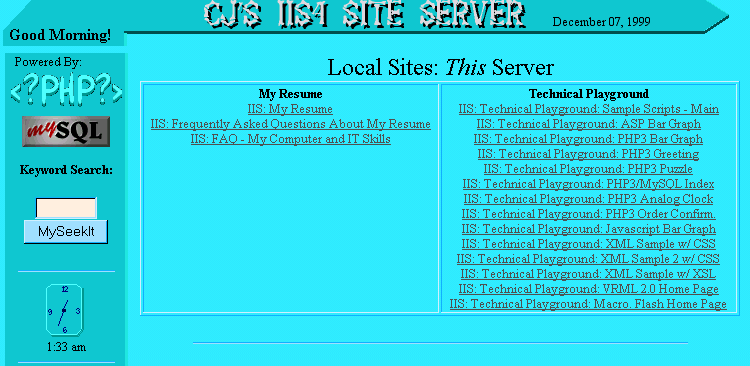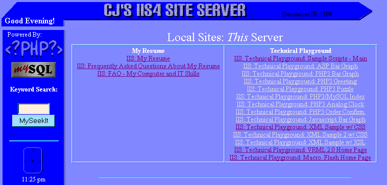 I use server-side includes to make changes to the format of my IIS pages much easier...changes to headers, side-bars, etc.  However, these SSI's have a twist to them:  The color schemes of my sites change 3 times a day (to prevent boredom) - Turquoise in the morning, Purple in the afternoon, and Blue at night.  In addition, the font on the header changes twice a day, while the greeting changes 3 times a day to reflect the time of day.  The sidebar contains images made on the fly using GD & Freetype, including the dynamic analog clock described in the next paragraph. (On my site, the clock also changes colors to match the scheme...the one below doesn't).  The content of the sidebar also changes based on the time of day.  In the morning, useful links to news & weather are displayed.  At night, links to programming resources are displayed (appropriate for me), etc.  Here are some screen shots of my SSI's in action: